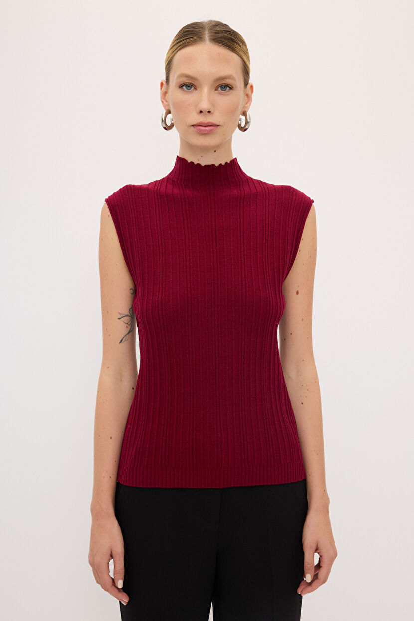 Claret Red Ribbed Detailed Knitted Blouse