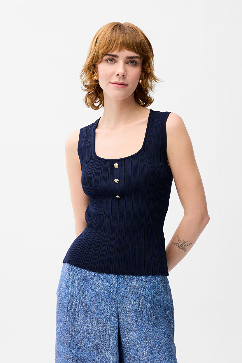 Navy Blue Knitwear Blouse with Sleeveless Buttons