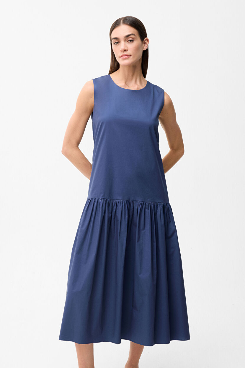 Navy Blue Sleeveless Poplin Dress with Tie Detail