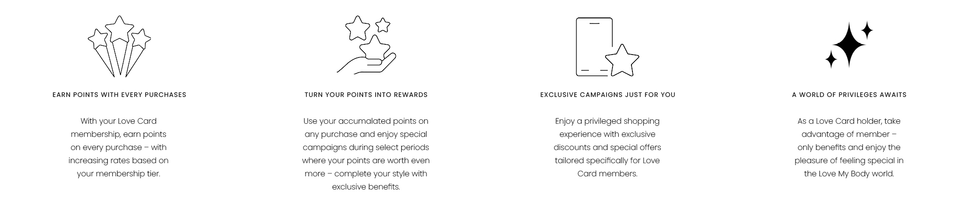 Love Card is a loyalty program based on points and segments, with 3 different tiers. Depending on your segment, you can earn more points on your purchases and enjoy special surprise gifts and privileges.