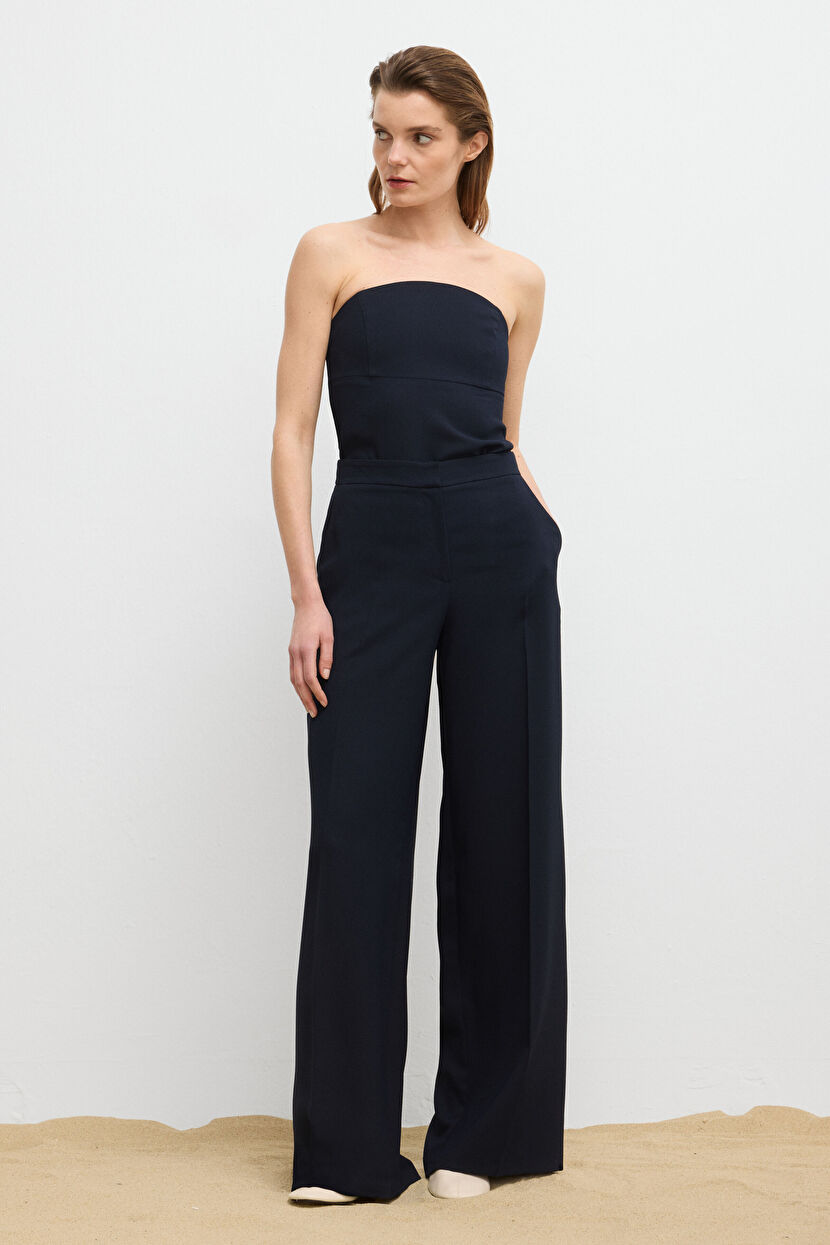Navy Blue Crepe Wide Leg Pocket Trousers