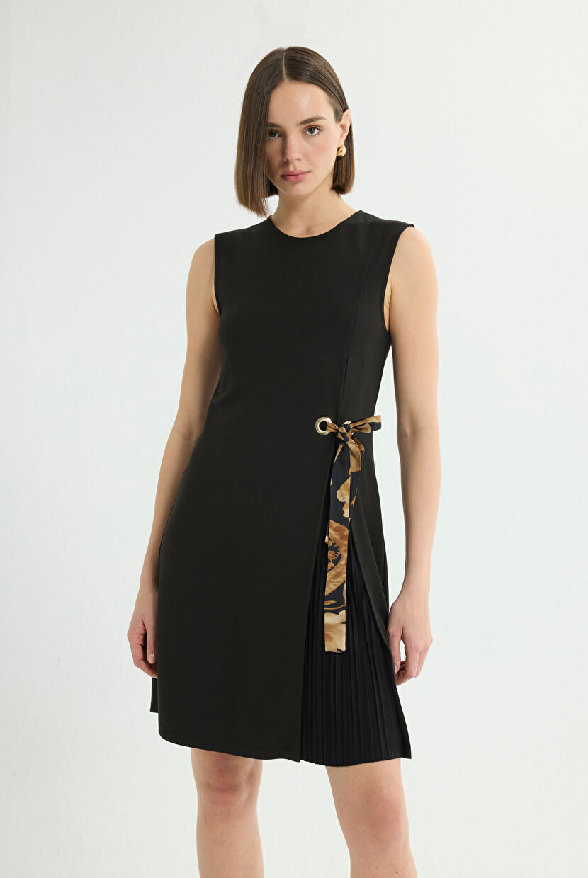 Black Women's Pleated Detailed Dress with Stoned Bird Eyes on the Collar