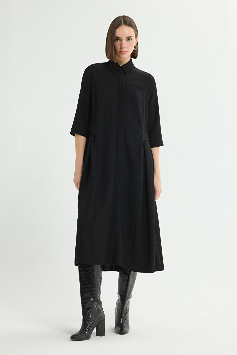 Black Women's Pleated Detailed Dress with Stoned Bird Eyes on the Collar 124L9732000-001 | adL