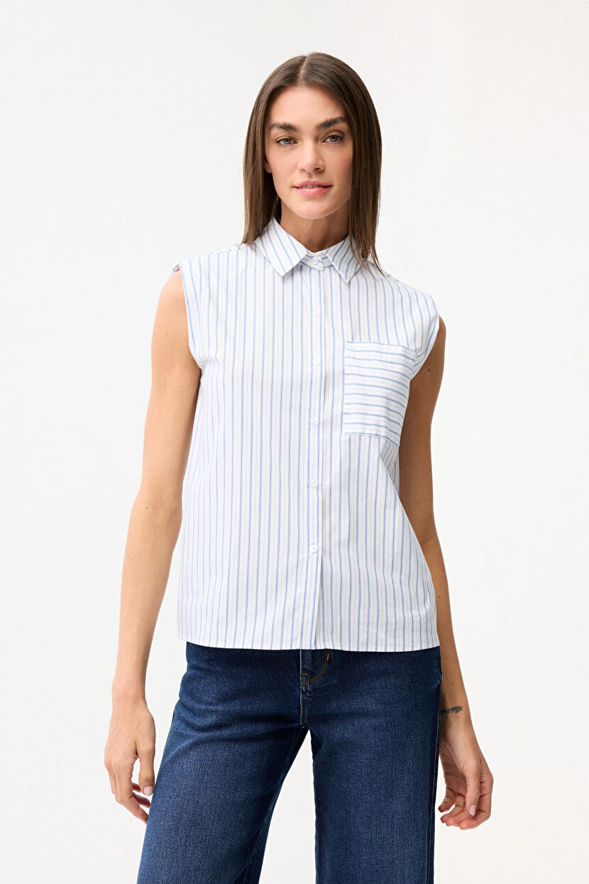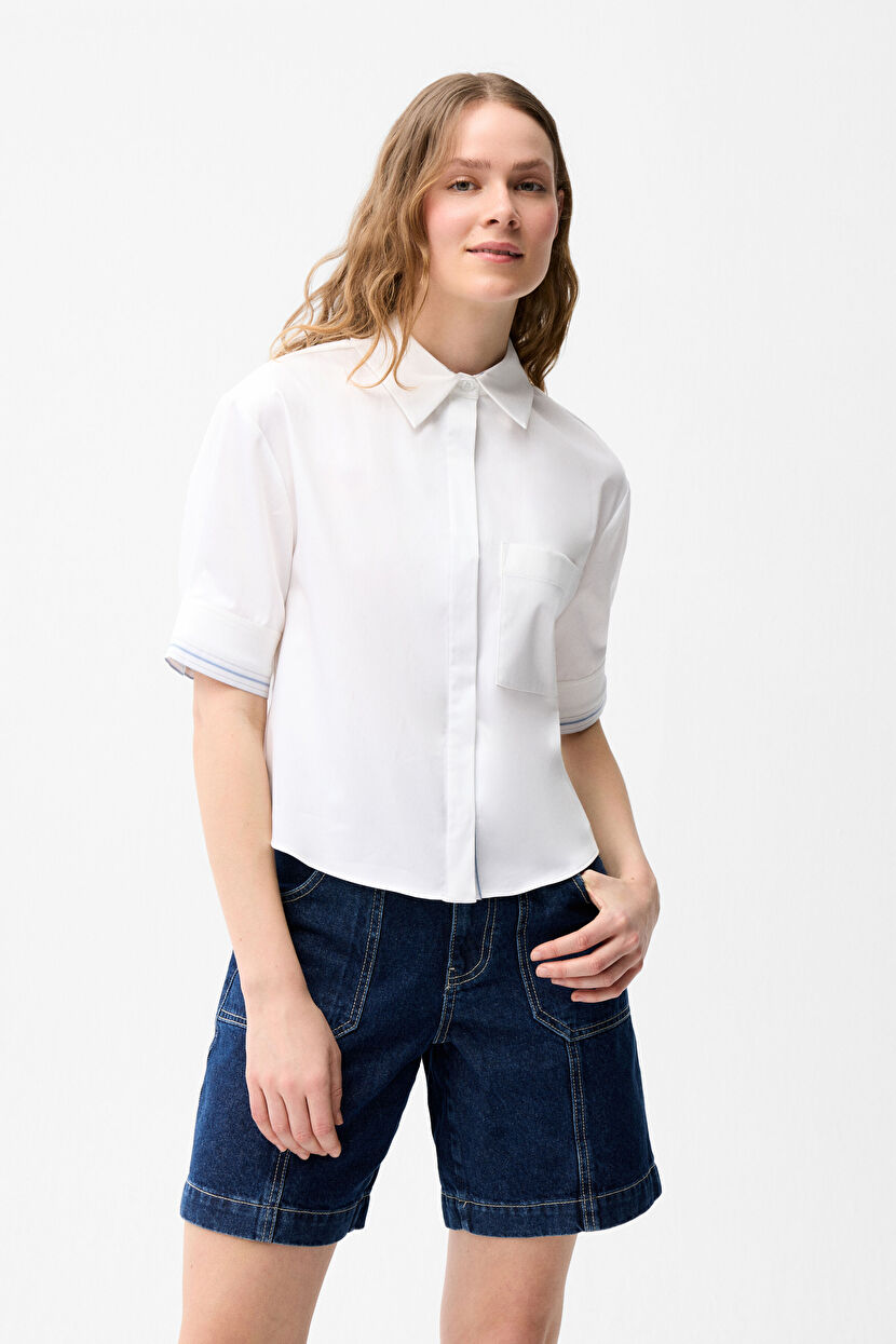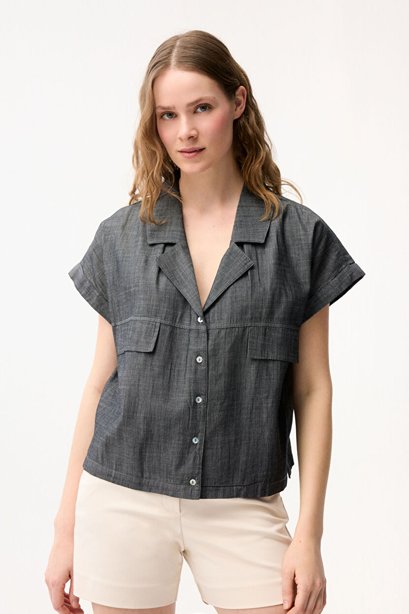Navy Blue Denim Look Patterned Short Sleeve Shirt