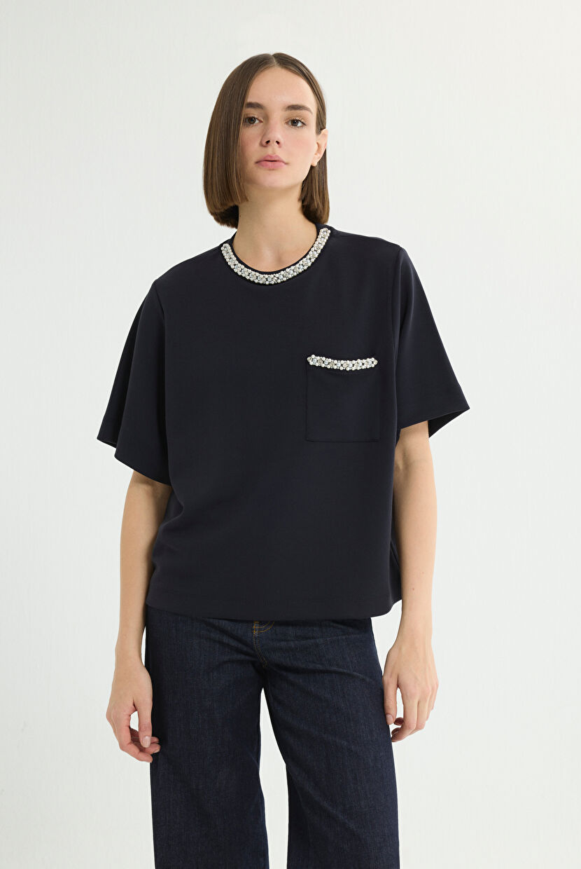 Navy Blue Embellished Collar T-Shirt