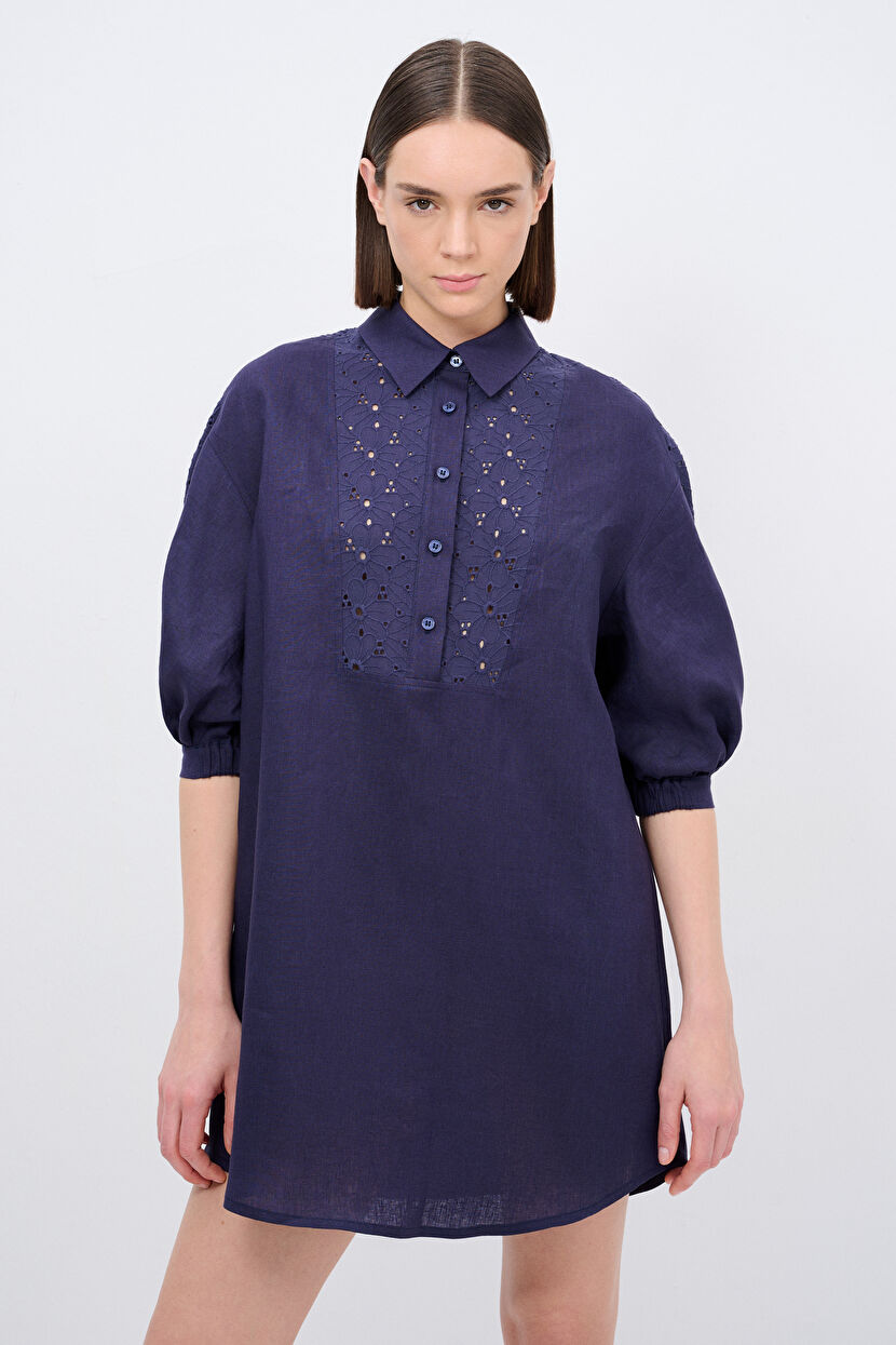 Navy Blue Linen Embroidered Dress
