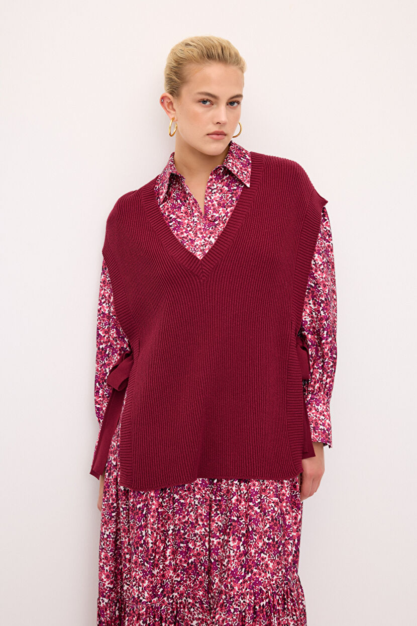 Claret Red V-Neck Side Tie Knitwear Sweater