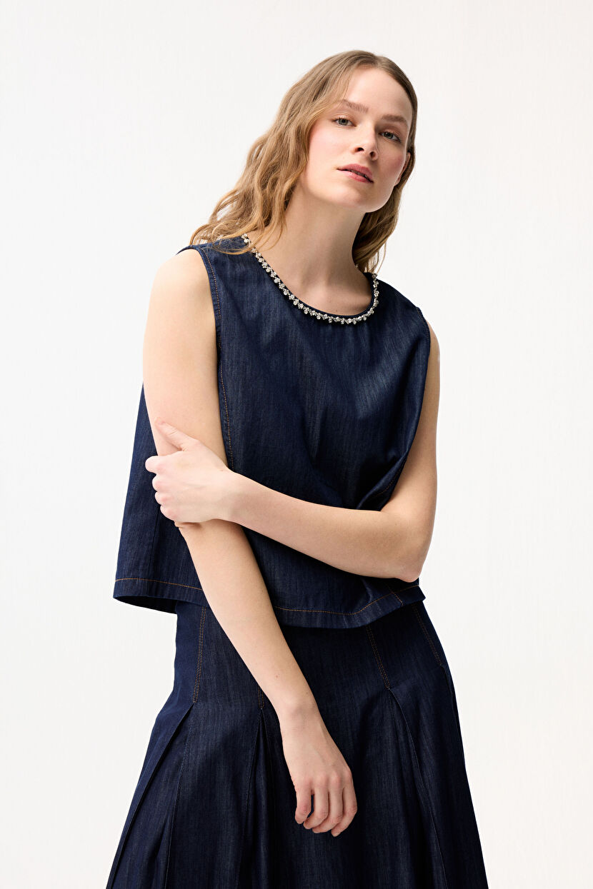 Navy Blue Denim Tassel Detailed Sleeveless Blouse