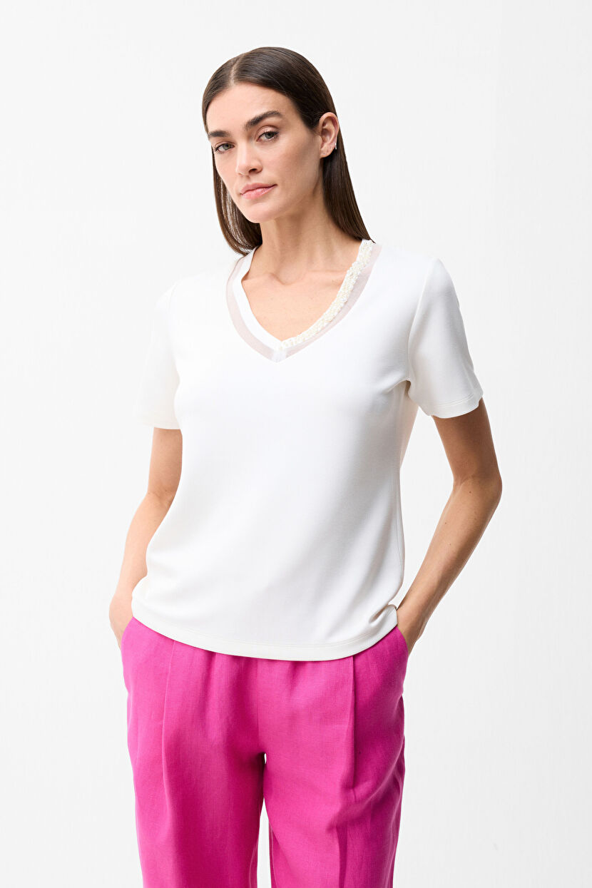 Bone Embellished Collar V Neck T-Shirt