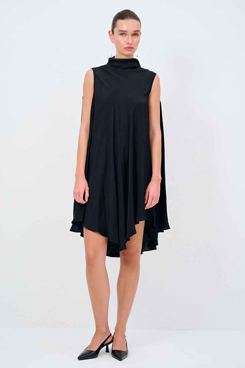 Siyah Moda Tutkusu Saten Dökümlü Elbise