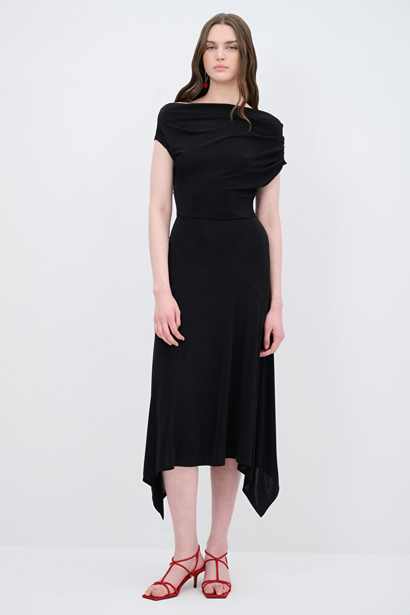 Siyah Örme Tek Omuz Volanlı Elbise