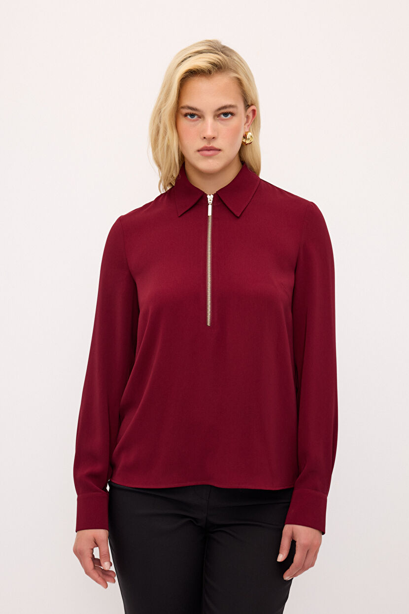 Bordo Fermuar Detaylı Bluz