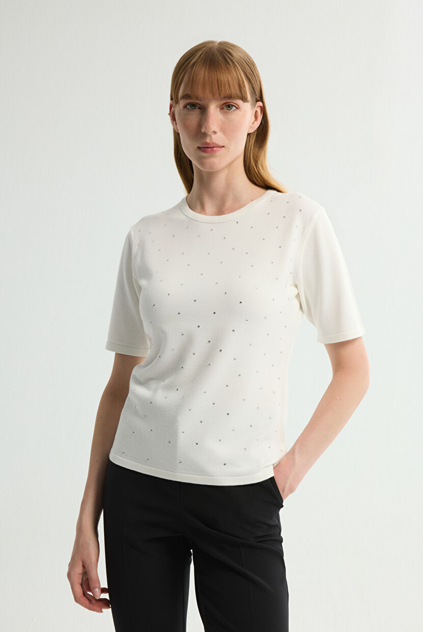 Kemik Yuvarlak Yaka Kısa Kollu Triko Bluz