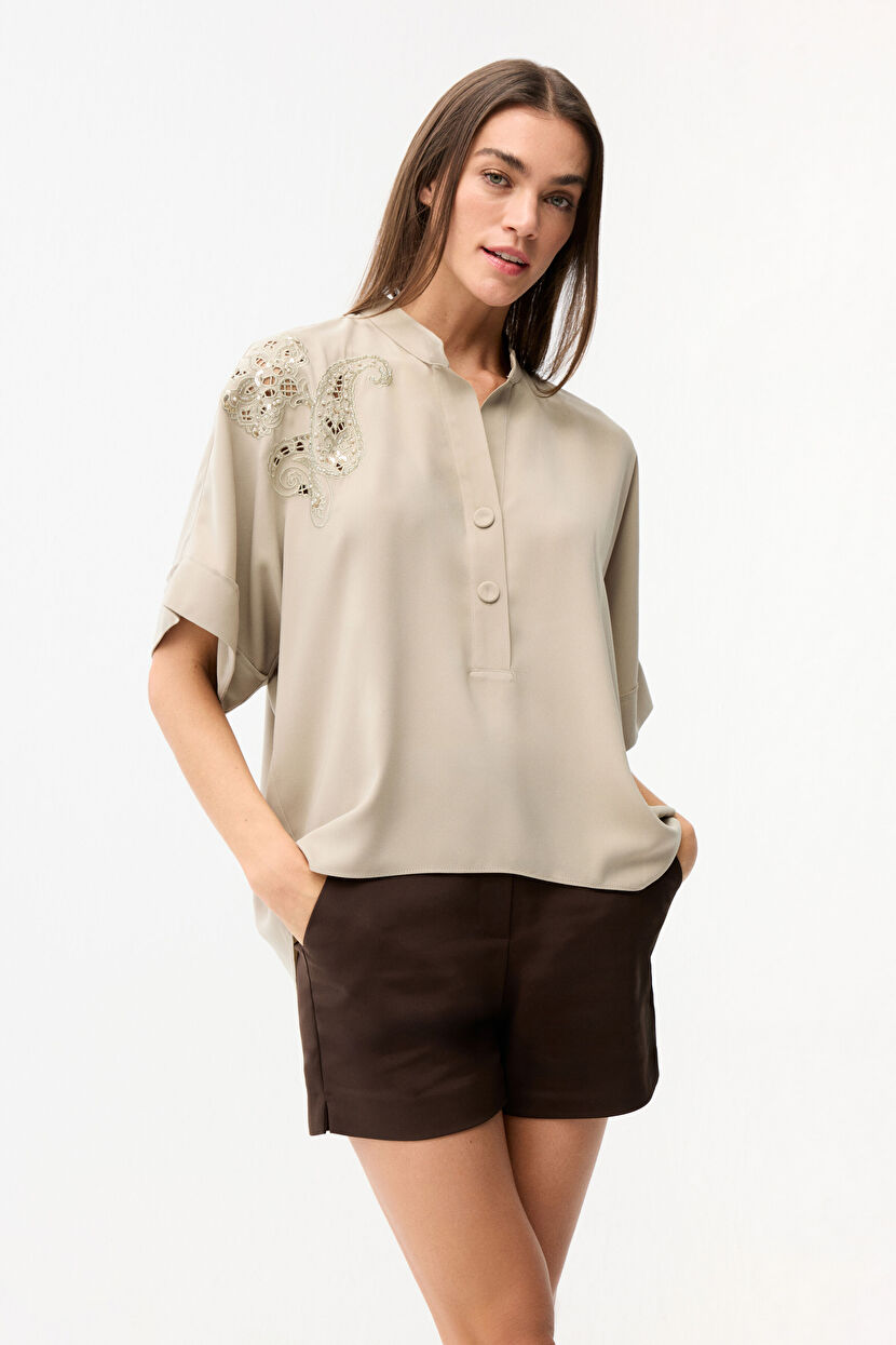Koyu Mint Nakış Detaylı Kısa Kollu Bluz