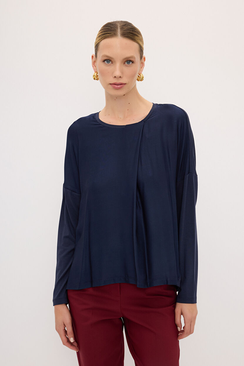 Lacivert Saten Garnili Uzun Kollu Bluz