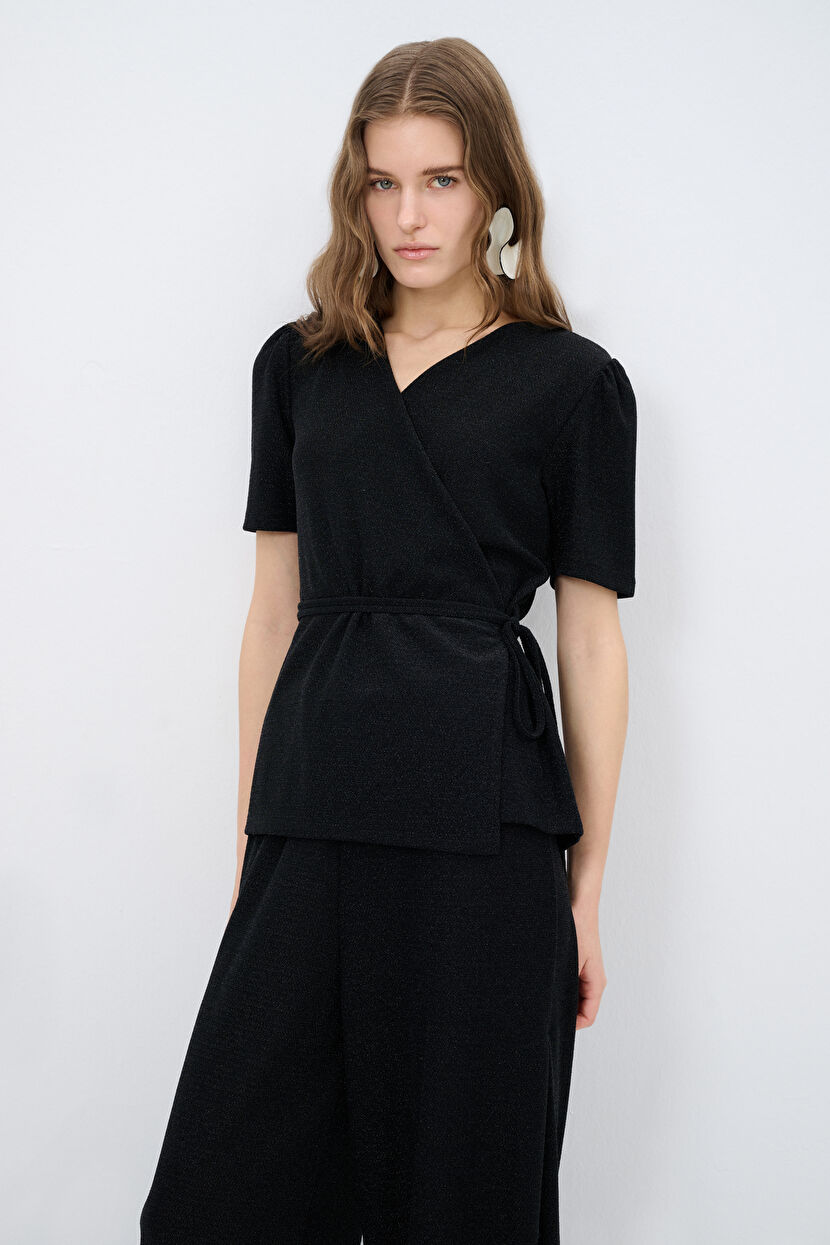 Siyah Kruvaze Kısa Kol Örme Bluz