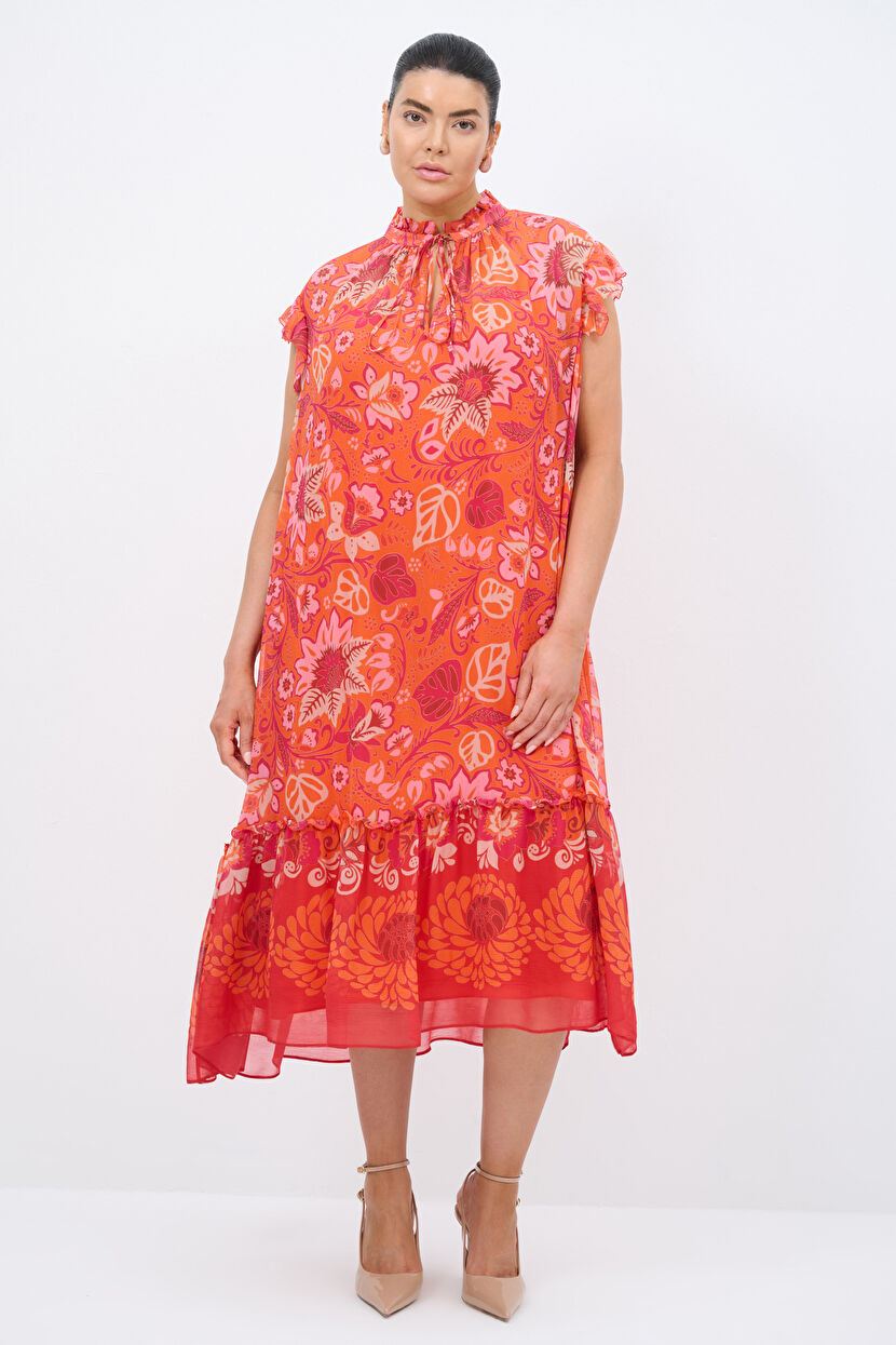 Turuncu Desenli Şifon Elbise