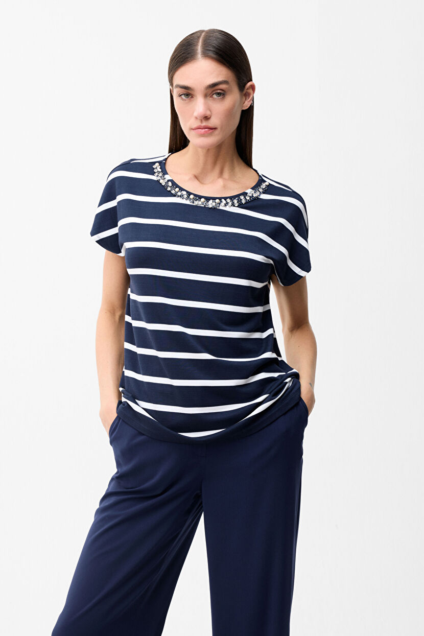 Lacivert Yakası taşlı ringelli bluz