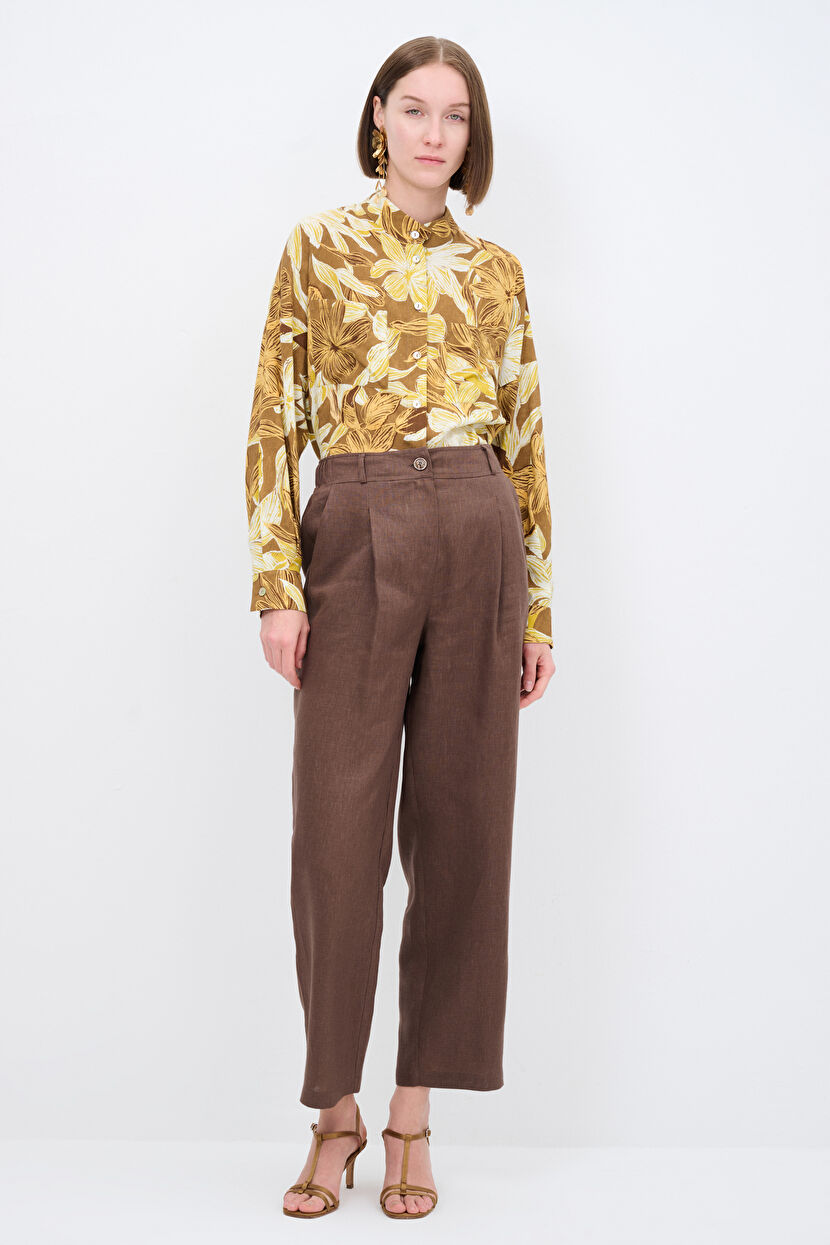 Pembe Desenli Beli Lastikli Keten Pantolon