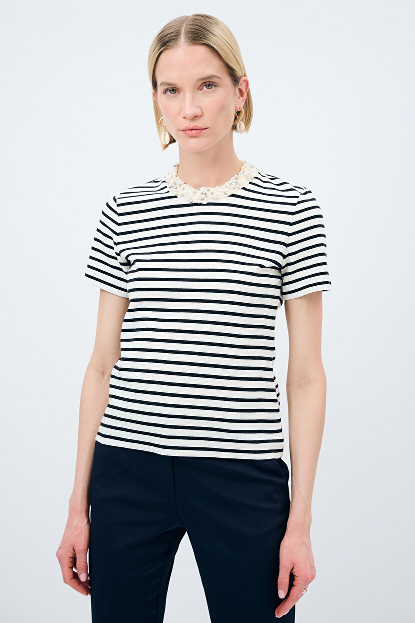 Kemik Yakası Taşlı Çizgili Bluz