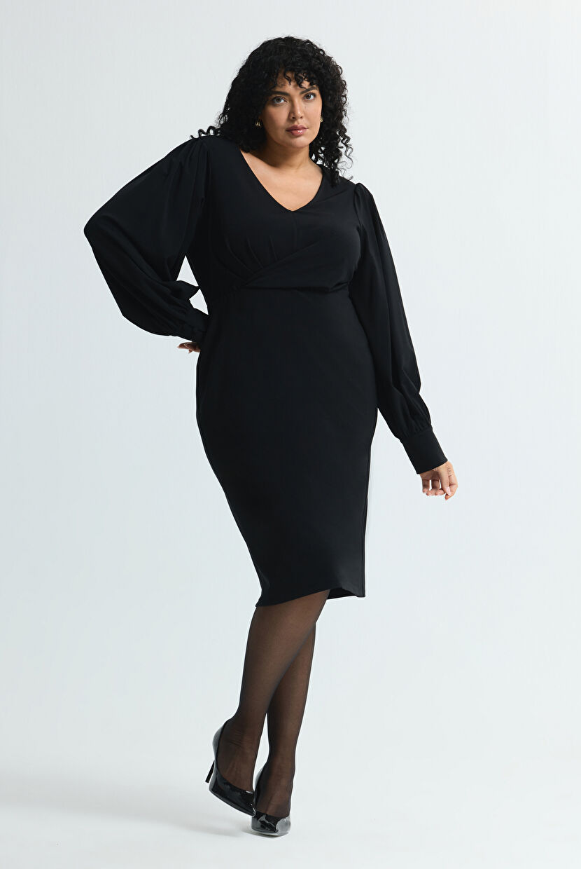 Siyah Büzgü Detaylı Önden Düğmeli Elbise