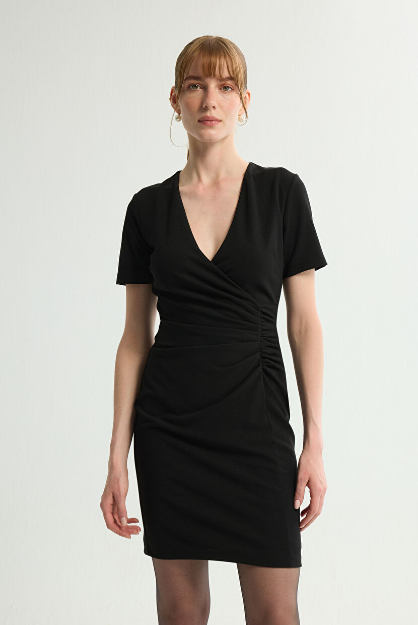 Siyah V Yaka Kruvaze Elbise