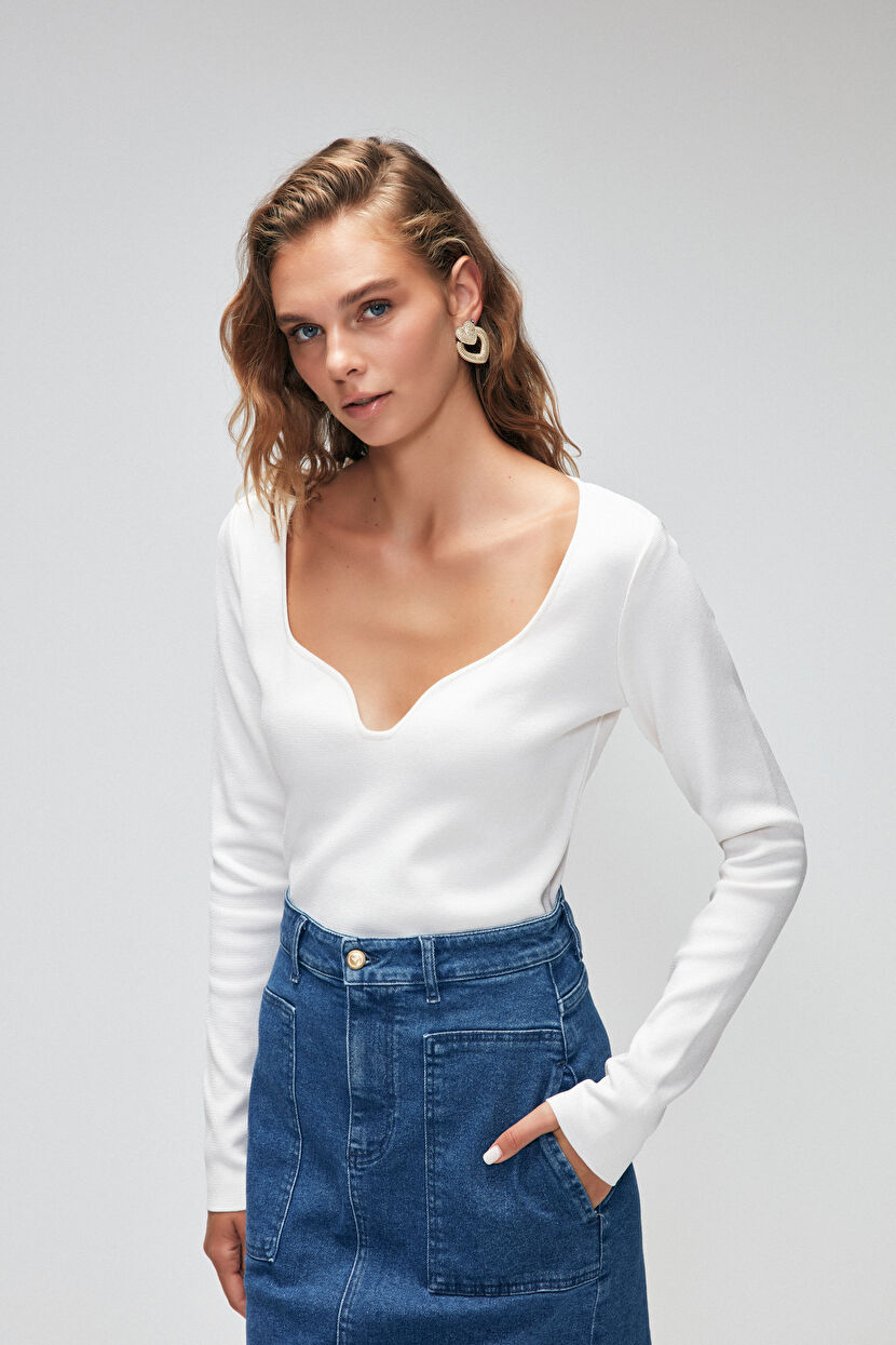 Kemik Moda Tutkusu Kalp Yaka Triko Kazak