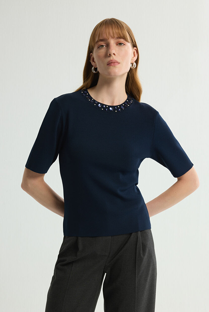Lacivert Yakası Taş Detaylı Triko Kazak