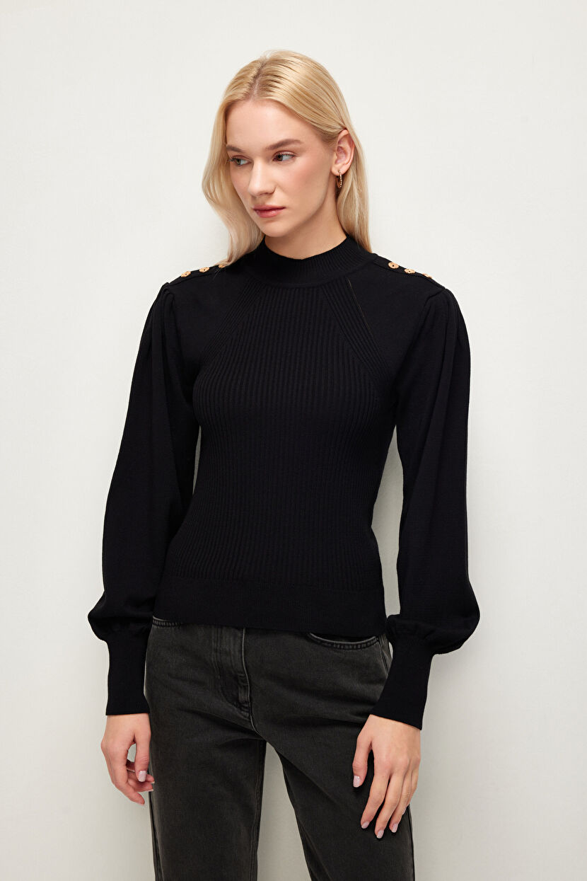 Siyah Omuz Düğme Detaylı Triko Kazak