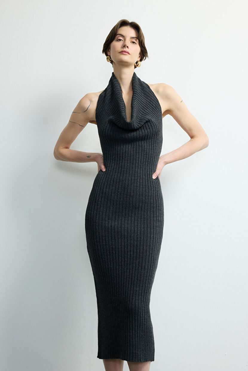 Gri Balıkcı Yaka Sırtı Acık Triko Elbise