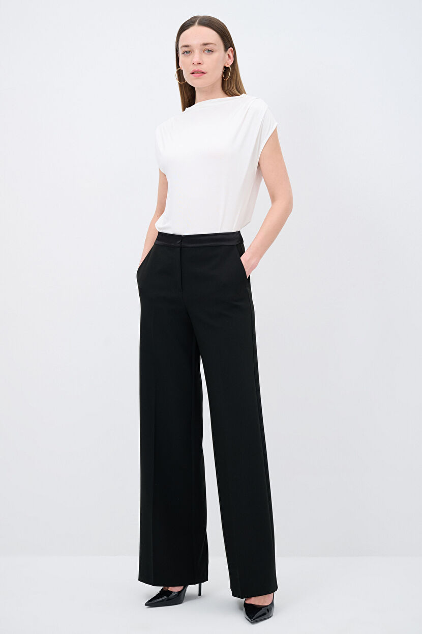 Siyah Saten Detaylı Bol Paça Pantolon