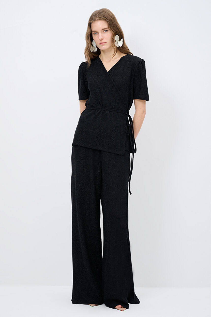 Siyah Kruvaze Kısa Kol Örme Bluz