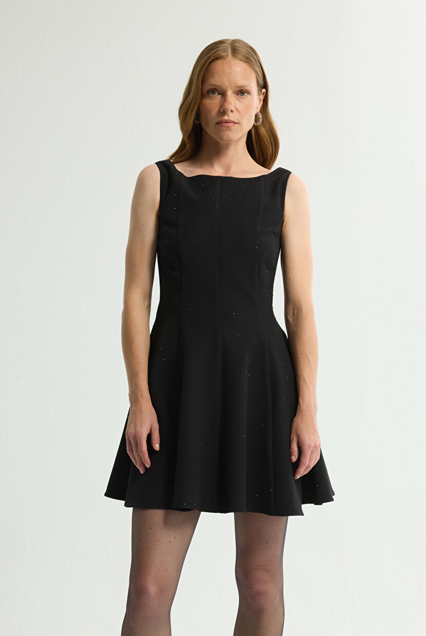 Siyah Taş Detaylı Gabardin Elbise