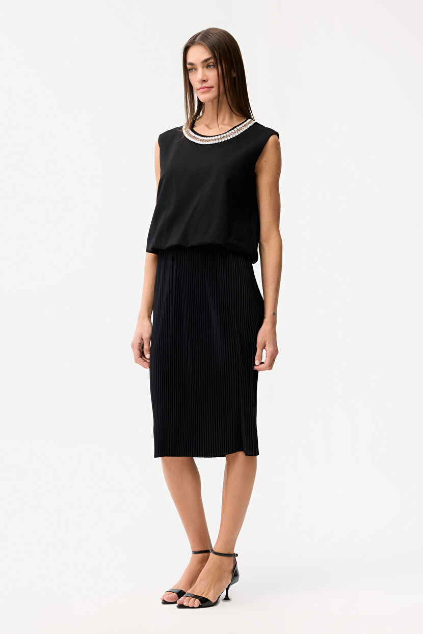 Siyah Yakası taşlı pileli elbise