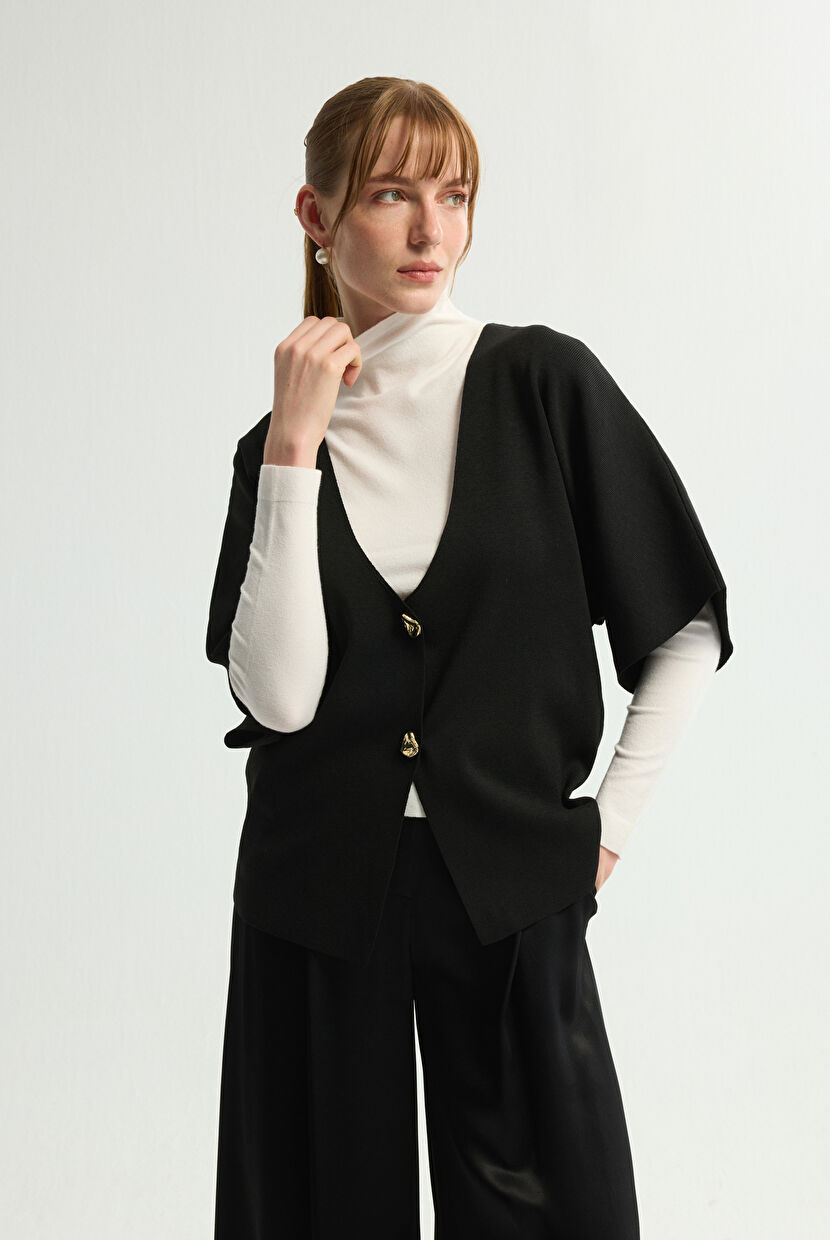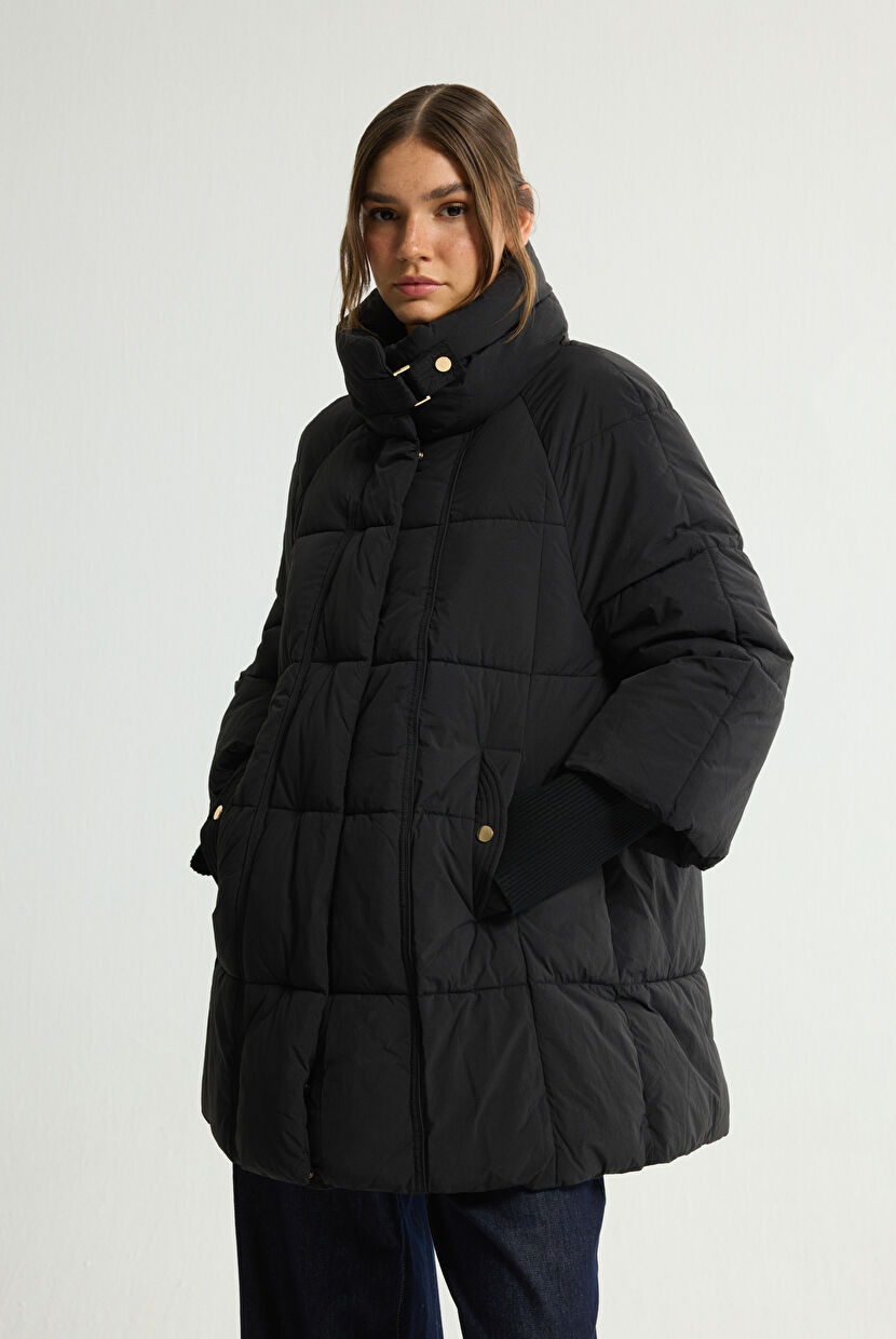 Siyah Uzun Kol Yün Karışımlı Kaban