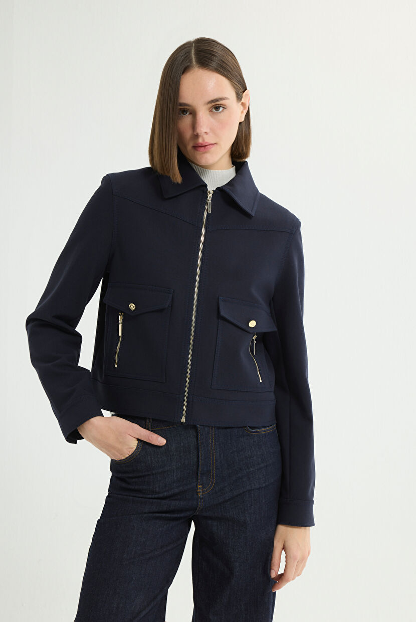 Lacivert Cep Detaylı Önden Fermuarlı Ceket